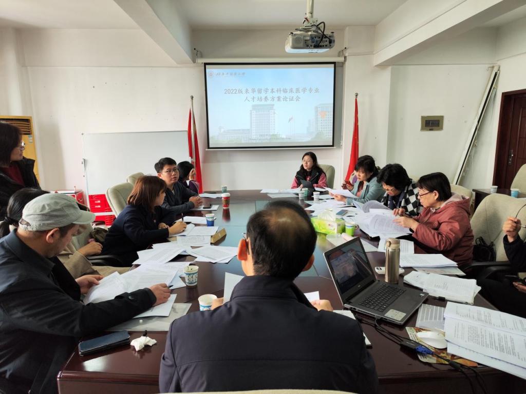 会议第二个议题为来华留学生本科临床医学专业培养方案论证。自202112月起,国际交流与合作处、雷火电竞亚洲官网成立了由王军文处(院)长任组长,李杰副处(院)长、伍参荣教授任副组长,来华留学本科教学督导组全体专家、教务科全体老师、来华留学生任课教师代表任成员的来华留学本科临床医学专业培养方案修订工作领导小组,计划通过四个阶段完成来华留学本科临床医学专业培养方案修订工作。此前,已完成前期调研与对培养方案修订稿的第一次论证。本次会议中,工作小组专家对第一次论证形成的培养方案修改稿进行了细致审阅。以南华大学、湖南师大、宁夏医科大学等兄弟院校临床医学专业本科培养方案以及巴基斯坦执业医师考试(PMDC)科目为参考,本着实事求是、稳中有进的原则,旨在制定突出重点、体现特色的培养方案。为了进一步合理分配各课程课时,本方案将重点考量课程体系与培养目标、毕业要求的平衡度;注重把握课程设计(内容)与培养目标、毕业要求的统合度。会上,工作小组就增设临床机能操作、外科基本操作导论等临床实践类课程,减少诊断学基础课时,注重基础课与专业课之间教学内容衔接等具体问题进行了热烈的探讨。