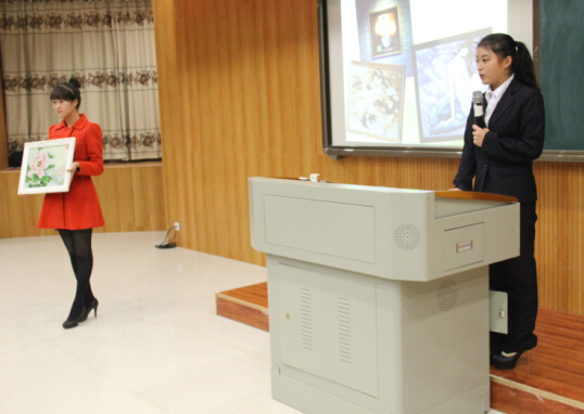 李江山院长发表讲话。他表示,本次活动意义重大,不仅发扬了湖中的文化,而且联系了中外友谊,将湖中文化推扬于国际。他对每一件都作品都加以赞赏,他说:"每一件作品都是湖中文化的象征,礼品小,情谊却深,礼品是展示才华的途径,也体现了同学们对外国友人的情谊。"