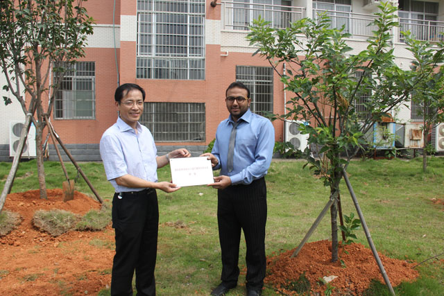 植树活动仪式上,2013届毕业生代表Anjam同学对学校五年来给予他们的关心和关怀表示感激。廖端芳校长对他们完成学业表示祝贺,希望留学生们毕业后能常回母校看看。