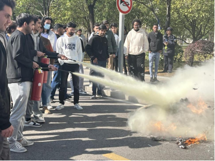 最后,消防讲解员还向全体师生现场教授了灭火器使用方法,并鼓励师生现场亲身试用,学生们按照指导方式,握着灭火器朝着火源精准喷洒,火势迅速控制。