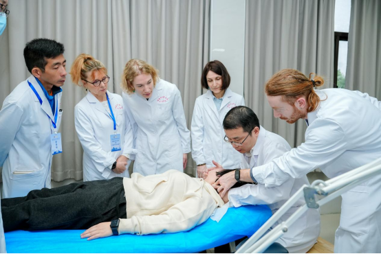 3月10日-21日,法国中医学院选派12名师生代表来到我校第一附属医院开展为期两周的针灸推拿学习。为保障研修班教学质量,医院精心组建导师团队,课程设计精细,从针灸推拿经典理论到实操环节,导师们手把手传授技巧,还安排学员进行临床跟诊,近距离观摩中医诊疗全流程,积累实战经验。学员们热情高涨,对中医药文化的博大精深展现出浓厚兴趣。