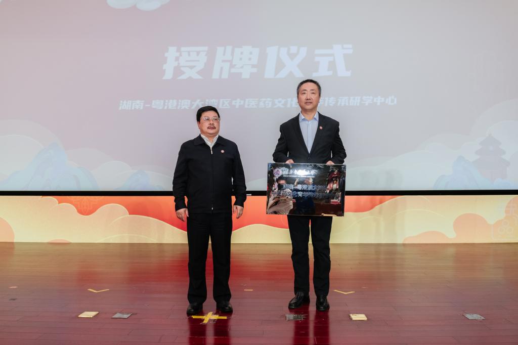 党委书记戴爱国为“湖南-粤港澳大湾区中医药文化青年传承研学中心”授牌。他强调,“湖南-粤港澳大湾区中医药文化青年传承研学中心”将为港澳和内地青年搭建“科技+”、“文化+”沟通桥梁和纽带的全新大数据平台,未来将持续加强湖南与粤港澳大湾区青年学子间的中医交流,大力促进中医药传承创新发展。