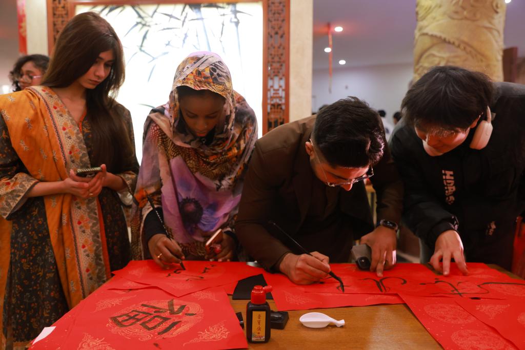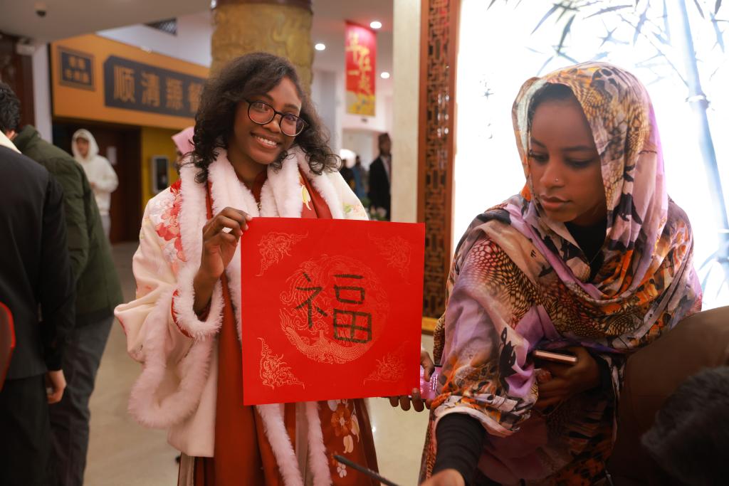 “第一次写毛笔字,真是太紧张了,我要把这个‘福’字拍下来发给家人,希望把龙年的祝福送给远在故乡的他们。”来自苏丹的蜜蜜(MATHANI AHMED ELTAYEB IBRAHIM)在老师的指导下,拿起毛笔,有模有样地写出了中国“福”。